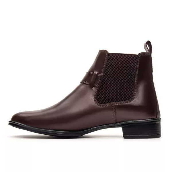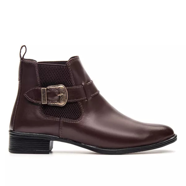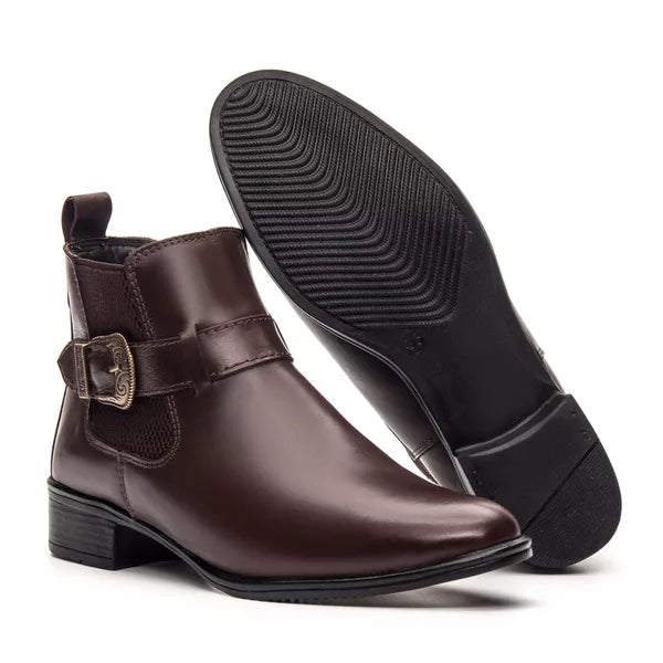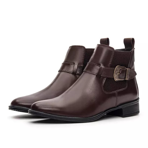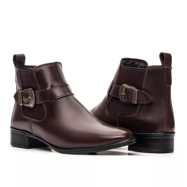 Bota Feminina Chelsea Café em Couro Legítimo Cano Médio com Fivela